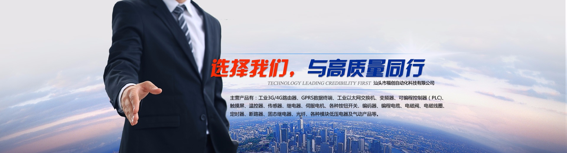 汕頭市福創(chuàng)自動化科技有限公司是一家集自動化元件的代理銷售與維修、自動化設(shè)備設(shè)計制造、自動化工程安裝改造、機電工程安裝改造、自動化機械設(shè)備設(shè)計與制造的企業(yè)。 主營產(chǎn)品有:工業(yè)3G/4G路由器、GPRS數(shù)據(jù)終端、工業(yè)以太網(wǎng)交換機、變頻器、可編程控制器(PLC)、觸摸屏、溫控器、傳感器、繼電器、伺服電機、各種按鈕開關(guān)、編碼器、編程電纜、電磁閥、電磁線圈、定時器、斷路器、固態(tài)繼電器、光纖、各種模塊低壓電器及氣動產(chǎn)品等。